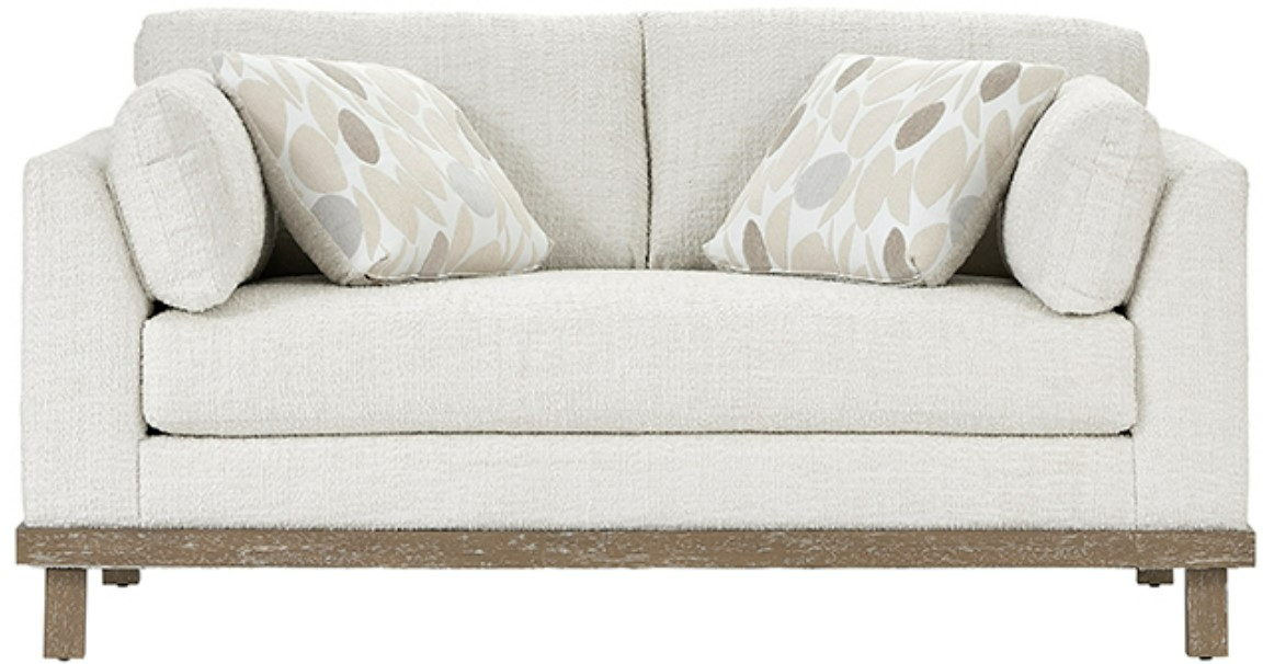 The Hughes Furniture® loveseat is a beautifully styled piece featuring neutral, snuggy porcelain-colored upholstery and elegant wooden legs. This loveseat is crafted on a hardwood frame with quality cushions and includes two coordinating throw pillows for added comfort and style. Its design and durable construction make it a versatile and inviting addition to living rooms.Read More