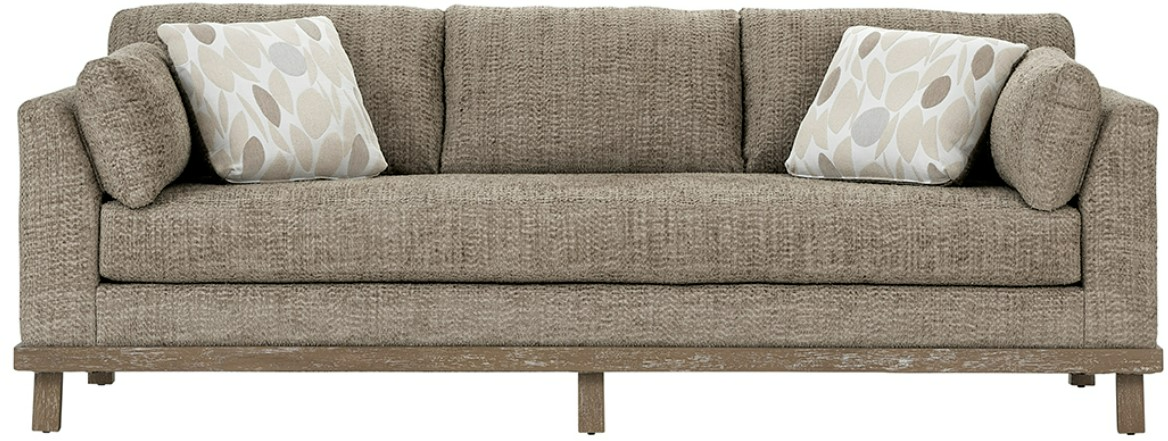The Hughes Furniture® sofa is a beautifully styled piece featuring neutral, snuggy taupe-colored upholstery and elegant wooden legs. This sofa is crafted on a hardwood frame with quality cushions and includes two coordinating throw pillows for added comfort and style. Its design and durable construction make it a versatile and inviting addition to living rooms.Read More
