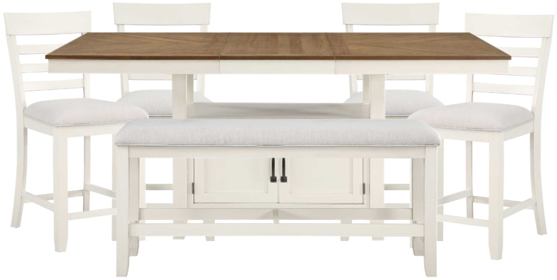 Relaxed, transitional styling in a neutral two-tone milk and honey finish are the hallmarks of the comfortable Hyland Counter Dining Set. A Storage Counter Table anchors any dining area ably with a 20-inch insertable leaf to expand to 80-inches for seating of up to eight.Read More